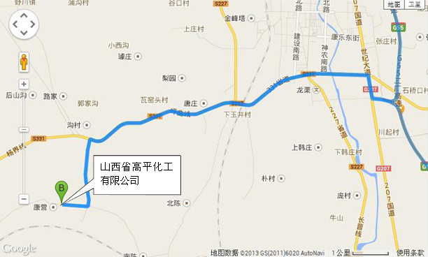 提示: 1、 查詢具體的行車路線請點擊圖中“山西省高平化工有限公司圖標” 2、 進入相應網頁后,在“目的地”欄輸入“高平市康營村”;在“出發地”欄輸入相應的地址提交即可。